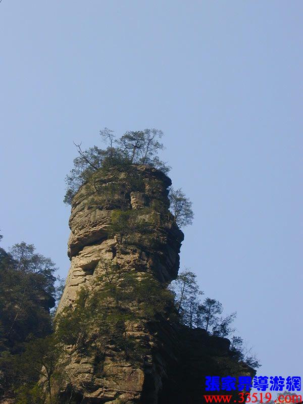 (亂竄坡)左邊這個坡,相傳向王天子兵敗后主力部隊從這里撤退上袁家界,進(jìn)天子山。這時,官兵追上來了,埋伏上的士兵一刀砍斷葛藤,滾木擂石潮水般砸了下來,打得官兵四處亂竄,以后就把這個坡叫“亂竄坡”。從亂竄坡可以上著名風(fēng)景游覽線袁家界,那里有后花園、迷魂臺、天下第一橋、天懸白練瀑布;還可以取道上天子山、進(jìn)楊家寨。大家抬頭看,就是這座孤峰,叫羊寨,那里是一片原始森林。