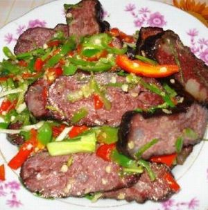 介紹: 血豆腐,就是將豆腐和豬血、豬肉及花椒、辣椒等佐料拌成泥狀,捋成卵形,以竹篩置火炕上,煙熏烤成臘黃,吃起來耐嚼味香,是土家特色菜,當?shù)厝顺R云湎戮啤?在張家界的飯館里很難吃到正宗的土家特色菜,可以去做土味的特色餐館去解解饞。但是最正宗還是鄉(xiāng)下人家家里自己熏的,那才叫一個好吃?。?!