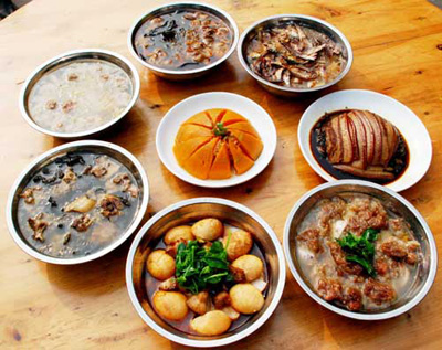 如果說靖港的吃名聞遐邇,有口皆碑,那么,八大碗則是靖港吃之翹楚,也是古鎮(zhèn)人引以為榮的傳統(tǒng)名牌。從前靖港街上數(shù)十家有名餐館,都把八大碗當作各自的招牌菜,各餐館的廚師也都是潛心研習,精益求精,把烹制出高水平的八大碗當作看家本領。曾經繁榮昌盛的“小漢口”靖港,那些停船上岸的船夫,載貨而來的生意人以及慕名而來的浪人,首先就得進餐館吃八大碗,飽其饞吻,享其口福,乃至為了貪吃八大碗而“船到靖港口,順風也不走。”而靖港街上的紅白喜事,也是非八大碗不成宴席。