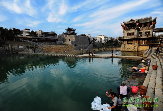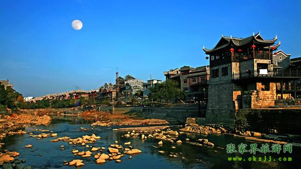 乾州古城城池小巧玲瓏,石城墻垣逶迤回環(huán)1980m,高5m,方溶江穿城而過(guò),沿江古街上被歷代行人的腳磨得光亮的青石板,既自然又精巧地鑲嵌著,沿街建有苗族特有的民宅——吊腳樓,具有濃郁的民族風(fēng)格。