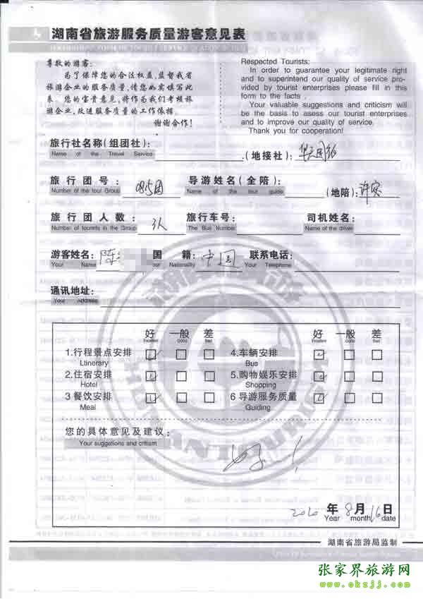 2010年8月16日陳小姐一行3位旅游質量反饋:一個“好”字,對我們的工作給予了充分肯定