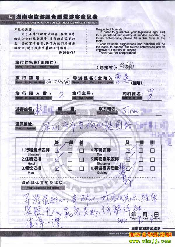 2010年2月4號林小姐一行兩位旅游質(zhì)量反饋