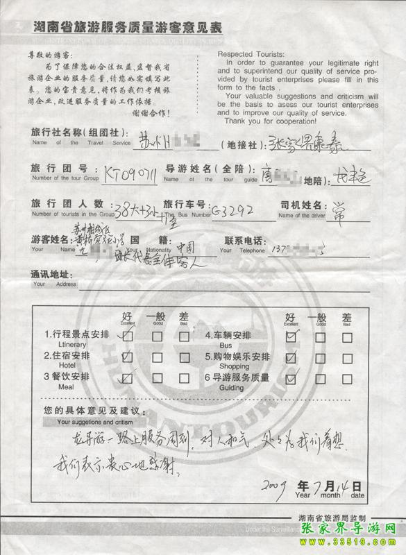 2009年7月14日蘇州尤女士一行41人質量接待反饋單: